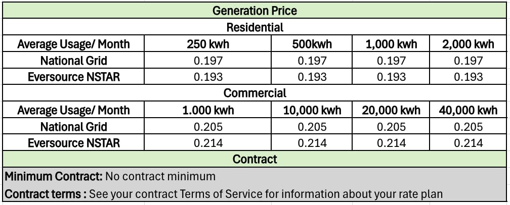 Generation Prices displayed are representative average prices for electricity at usage levels that are typical for residential customers. Contract items displayed present the length of your contract for generation service, and the price terms included in your contract. See your recent bills to determine average monthly use, and your Terms of Service for additional information.